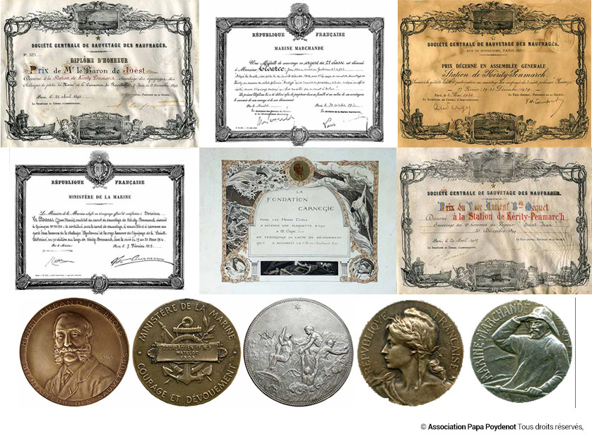Les photographies présentées ont été réalisées à partir d’originaux prêtés ; merci aux personnes qui les ont aimablement mis à notre disposition. Si vous détenez l’original d’une récompense décernée à un canotier de Penmarc’h dans la période allant de 1868 à 1952, merci de nous le prêter pour archivage numérique.